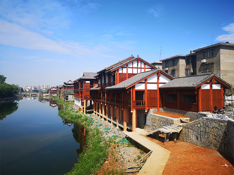 栗河吊腳樓沿河呈狹長(zhǎng)不規(guī)則帶狀,南北向進(jìn)深約25m,東西向?qū)捈s527m。項(xiàng)目占地面積12486.41平米(18.73畝),總建筑面積4520.87平米,分為A至J十個(gè)單體建筑,建筑層數(shù)1~2層,門面商鋪45間,沿河道均勻分布。建筑依據(jù)場(chǎng)地,與南側(cè)道路平行布置,建筑主入口面向場(chǎng)地南側(cè)道路,建筑沿河布局,底部1層為架空空間,其上為主體建筑,建筑整體風(fēng)格風(fēng)貌為仿明清時(shí)代,外觀簡(jiǎn)潔、大方,給人以明朗、周正的空間體驗(yàn)。契合時(shí)代新形象,尺度更為親切。場(chǎng)地內(nèi)部景觀主要由硬質(zhì)景觀與軟質(zhì)景觀共同構(gòu)成。硬質(zhì)景觀主要包括廣場(chǎng)、步道和活動(dòng)場(chǎng)地,軟質(zhì)景觀主要是綠化種植。